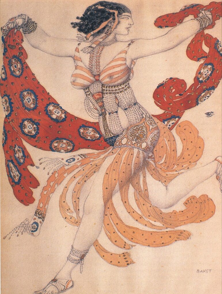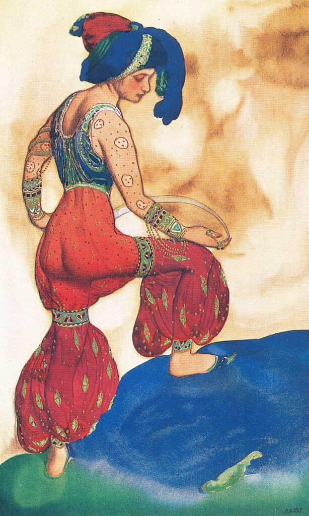 - Costume Design for Scheherazade, 1910, Leon Bakst, Public Domain. https://www.wikiart.org/en/leon-bakst/costume-design-for-scheherazade-1910