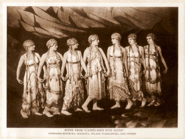 - Chorus of maenads. Photograph 1912 by Adolf de Meyer from the 1914 book Nijinsky: L’Apres-midi d’un Faune, Costumes de Léon Bakst, Public Domain.