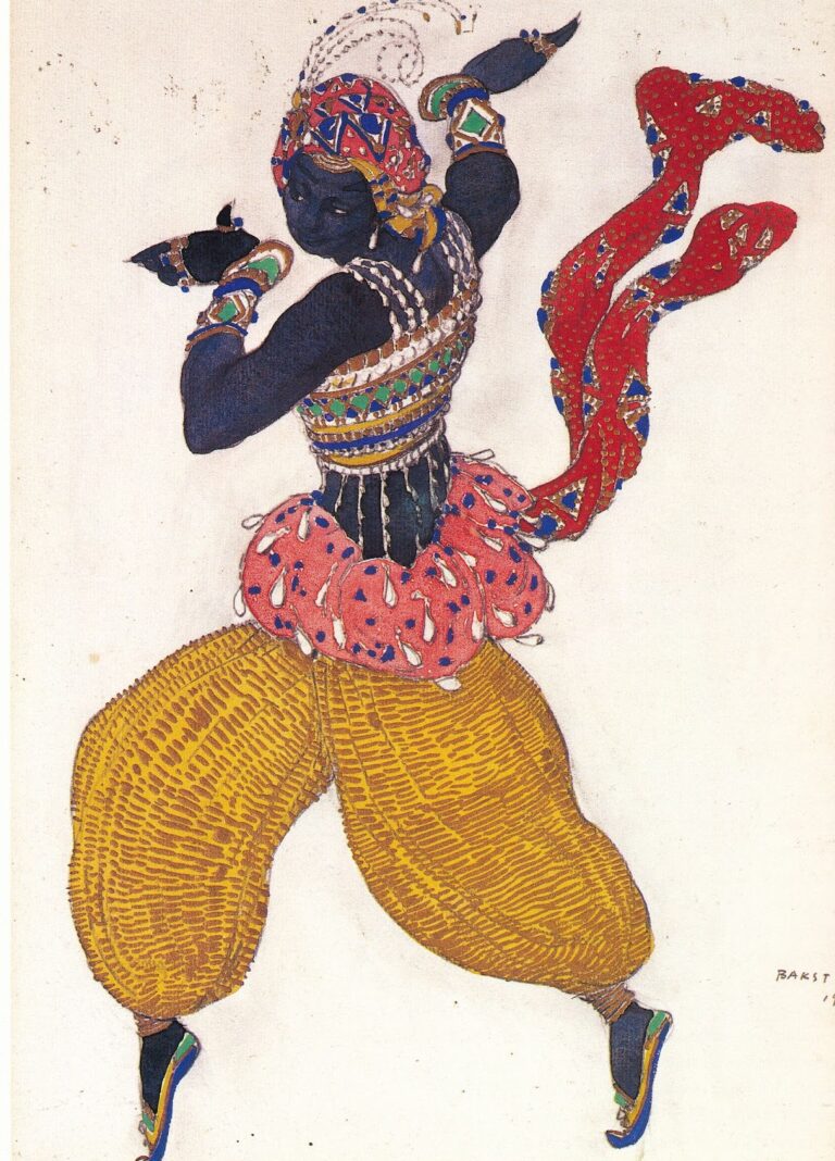 - Costume design for a dancer Nègre Diamanté: costume design for Scheherazade, 1910, Leon Bakst, Waddesdon, The Rothschild Collection (Rothschild Family Trust, Public Domain. https://commons.wikimedia.org/wiki/File:Scheherazade_by_L._Bakst_13.jpg