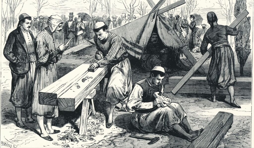- Turkish Builders at The Crystal Palace Exposition, 1851, Etching, Vintage print from Jamila Salimpour’s Danse Orientale Archives, Public Domain. In article