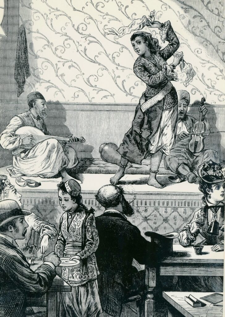- Scene in the Tunisian Cafe — The Scarf Dancer, Etching, American Centennial, Philadelphia, 1876, Vintage print from Jamila Salimpour’s Danse Orientale Archives. Public Domain. Image in folder