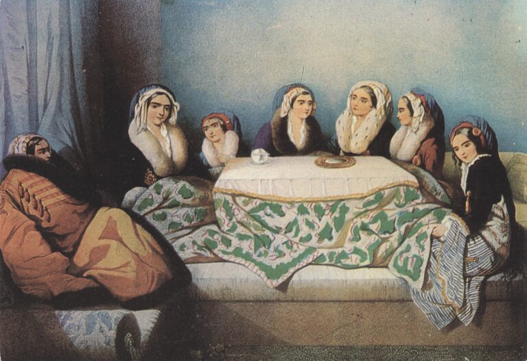 - Turkish harem ladies lounging, Painting by Camille Rogier, Public Domain.