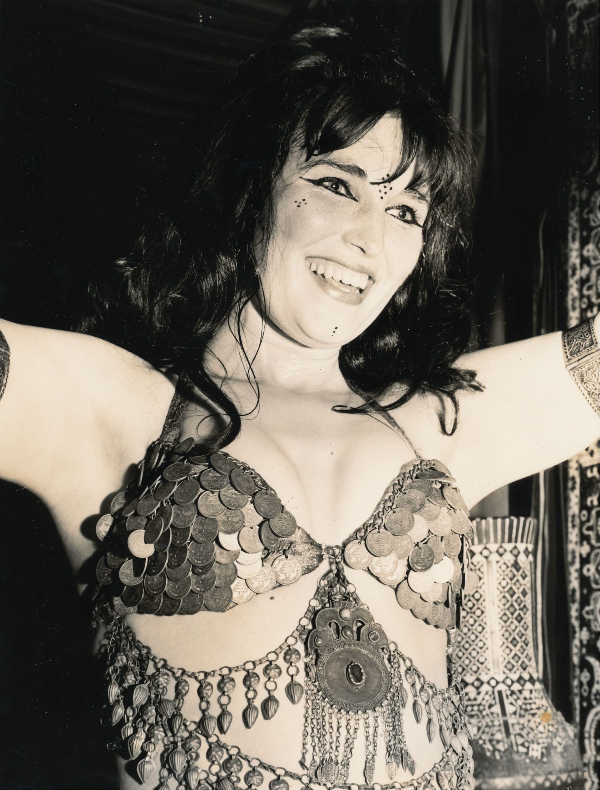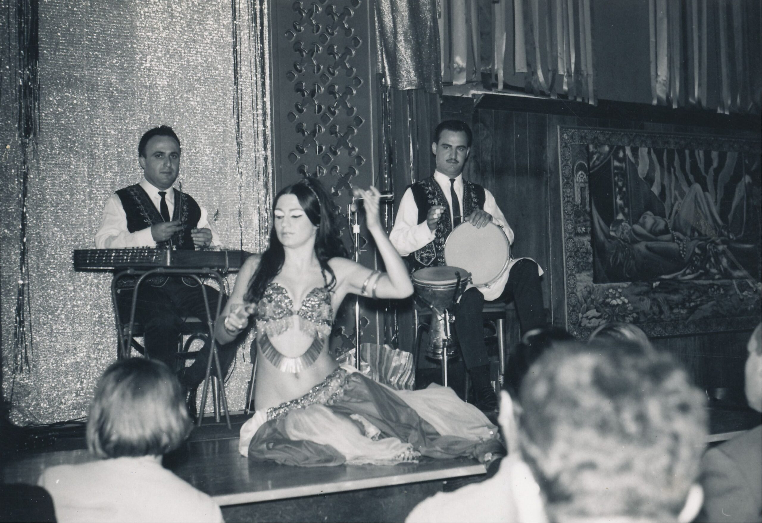 Just as Jamila observed Middle Eastern dancers in the nightclubs of California, the dancers in New York were doing the same. Sabah Nissan who worked in the early days of the 8th Avenue clubs of New York City said that she would “go down to Philadelphia and dance with Armenians,” then go to a Turkish or Arabic hafla (Arabic for “Party”), and notice that the people would execute similar movements with different characterization and stylization. She said that at an Armenian gathering, one wouldn’t use her hips, but at an Arabic or Turkish party, one would.¹⁰ The sheer frequency of performance engagements helped many dancers learn, as many were dancing sets as long as 40 minutes three-to-six nights a week; some of the dancers from the Middle East even helped the Americans.¹¹