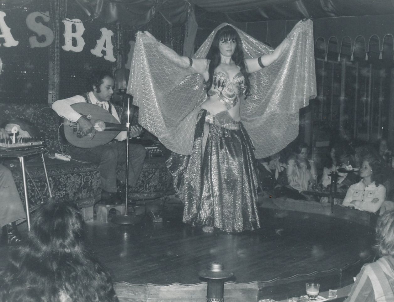 The Middle Eastern nightclub came to northern California in the 1960s. In Fresno, the Armenian immigrant community grew, and a restaurant known as the Baghdad (different from Jamila’s Bagdad Cabaret) featured entertainment on the weekends. According to Aisha Ali, by 1963, the demand in San Francisco for Oriental dancers had grown, and both 12 Adler Place and a nearby venue called Gigi’s had opened in North Beach. She notes that the sound of the music in San Francisco, in addition to being a mix of Middle Eastern musical styles, also incorporated Persian and even Hispanic musicians and instruments.¹⁶ By the mid-60s, the Jamila Salimpour and Yousef Kouyounjian had opened the Bagdad Cabaret on Broadway; the Casbah opened shortly afterwards.¹⁷