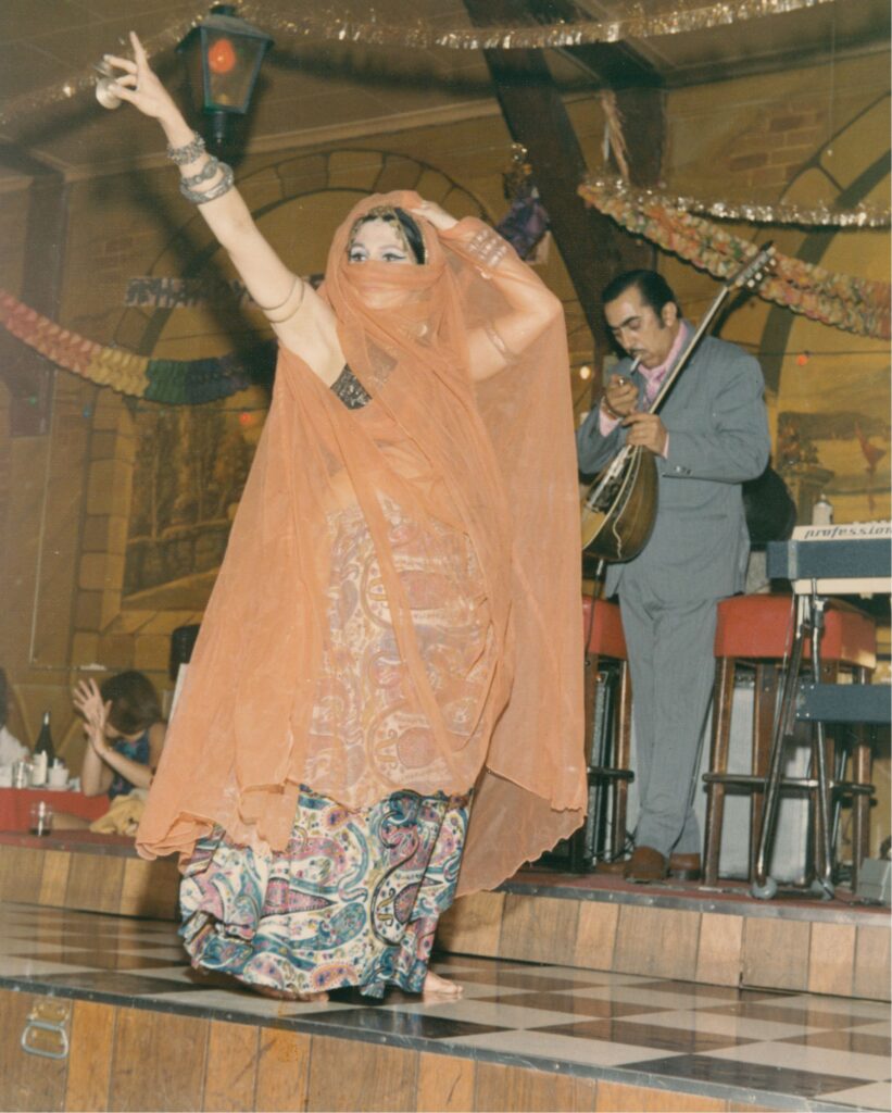 By 1959, the Fez Supper Club opened in Hollywood, professional dancers from the Middle East had begun coming to Los Angeles more frequently. When Hershaway’s closed, the Fez was the only Arabic cabaret in the Los Angeles area, and did a thriving business. Many of their patrons were Americans who had just discovered Arabic music and dance.¹³ The Fez, owned by the Shelby family, featured dancer Zenouba (née Leila Elwi) and a musical group called the Oriental Trio, which included tabla player Mohammad El Miri, his wife Shiham who sang, and Khamis El Fino on cümbüş (a 20th century Turkish banjo). Maya Medwar, originally from Syria, also performed at the Fez; before coming to the United States she had attended the High Institute for Acting in Cairo where she studied dance and drama. She also trained with Mahmoud Reda’s brother, Ali.