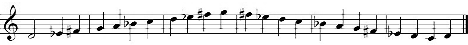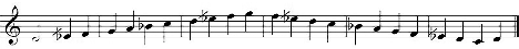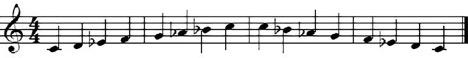 The next example is in the key of C minor. You can see that several of the notes have been altered with a flat sign, lowering those notes by a half of a tone. These flats change the character of the scale completely: