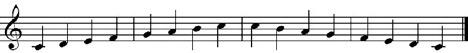 In the example above, the ascending C major scale is defined as: C to D, a whole tone; D to E, a whole tone; E to F, a half tone; F to G, a whole tone; G to A, a whole tone, A to B, a whole tone, B to the final C, a half tone. The same note relations exist in the descending scale.