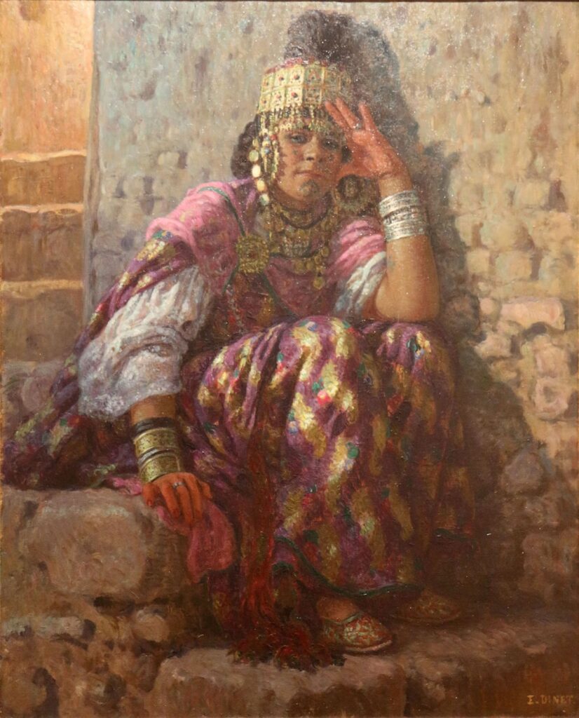 Many painted dancing girls came from France rather than Port Said. Toulouse-Lautrec sketched a belly dance on a stall in the Montmartre, but A.E. Dinet painted first hand the sensuality of Algerian Ouled Naïl. The numerous dancing girls in Algerian paintings belonged to the Ouled Naïl troupe; decked in light gauze and heavy jewelry, they had been a great success at the Exhibition Imoverselle of 1900 in Paris. Clairin visited Algeria several times and exhibited his dancer portraits.