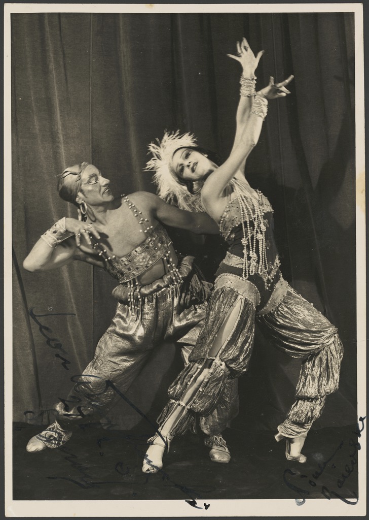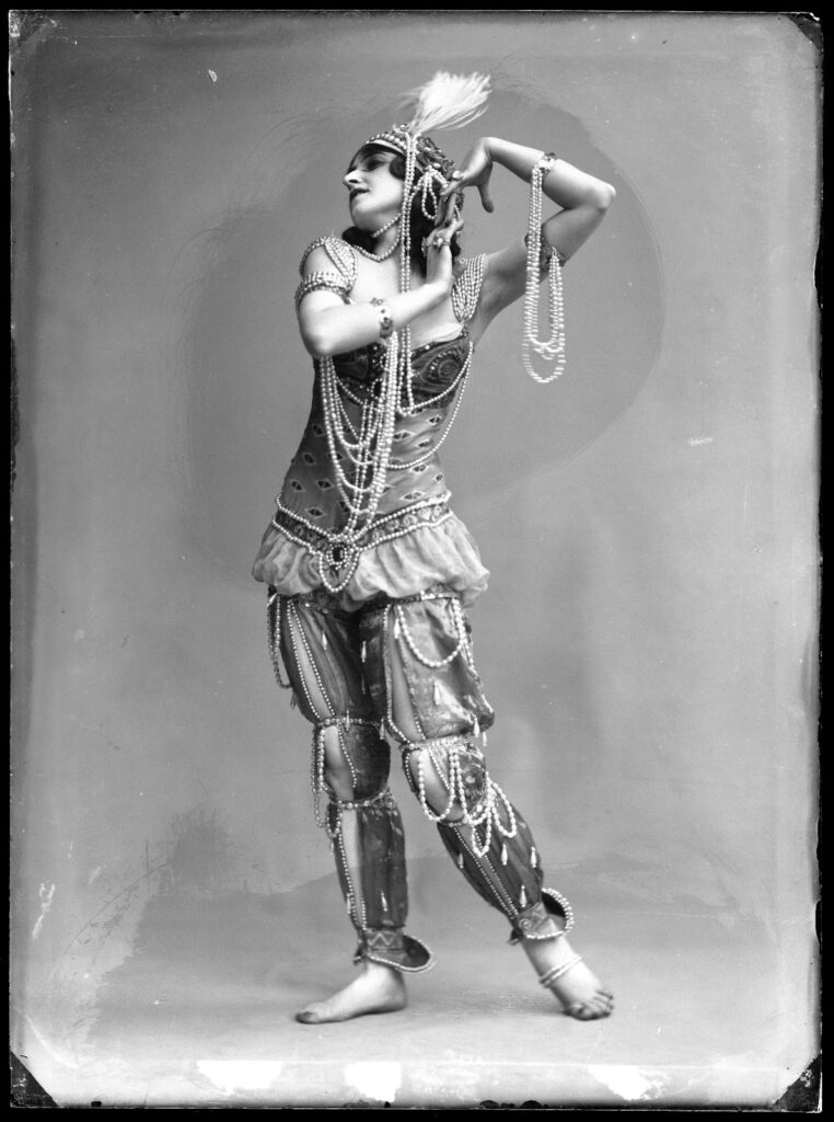 “…wide pants and an embroidered jacket, eyes made up with antimony; the jacket goes only as far as the pit of the stomach while the trousers, held up by a huge cashmere belt folded several times, do not start higher than about the pubis, so that the whole stomach, the loins, and the upper part of the buttocks are naked under a thin black veil. . .which ripples round the hips with every movement they made – the face expressionless under the greasepaint and the seat which is running down…”