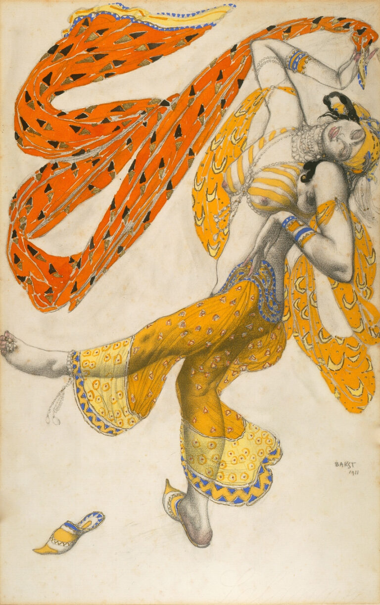 The veil as we know it in belly dance—a three-to-four yard of lightweight fabric used as a prop—is a recent invention. In her article, Jamila introduces us to the practice of full-body veiling in ancient classical societies, but the current practice of using a veil in Oriental dance performances is relatively new. The use of fabric as a prop outside of dance, however, dates back a bit further. 19th and early 20th century paintings and photographs of Arab women posing scarves, shawls, and head coverings¹ may or may not have been accurate depictions of these women, but merely posed for a sensational photo.² Dance researcher Laurel Victoria Gray notes that the dancers of the Ballets Russes used veils in some of their “Oriental” choreographies such as Salome and Cléopâtre, “perhaps borrowing the idea from the Caucasus” or inspired by Oscar Wilde’s Salome. She also notes that while small scarves are a common element in some folk dances, such as Azeri and the dances of the Turkish çengi, veils themselves are rare as a dance prop; if they are used, they are attached to a small pillbox hat, and primarily in Central Asia.³